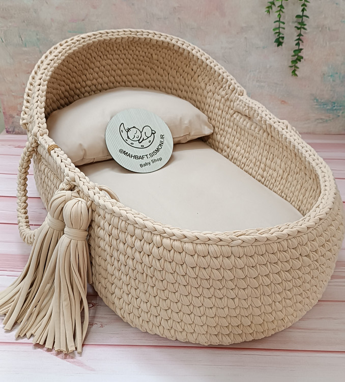 کریر تریکویی نوزاد مدل نیمه سایبان همراه با تشک و بالشت کتان نخ ترک