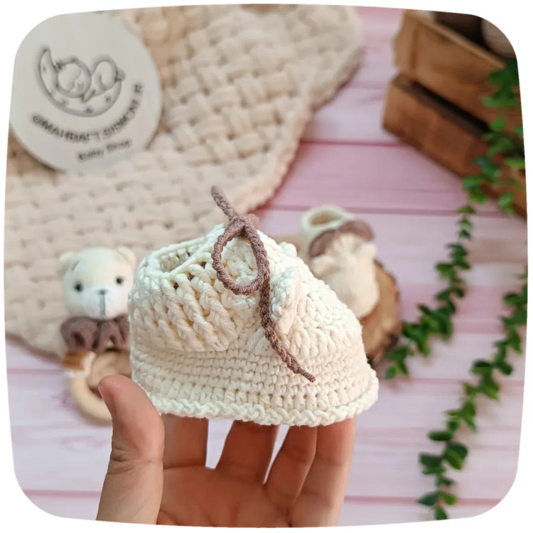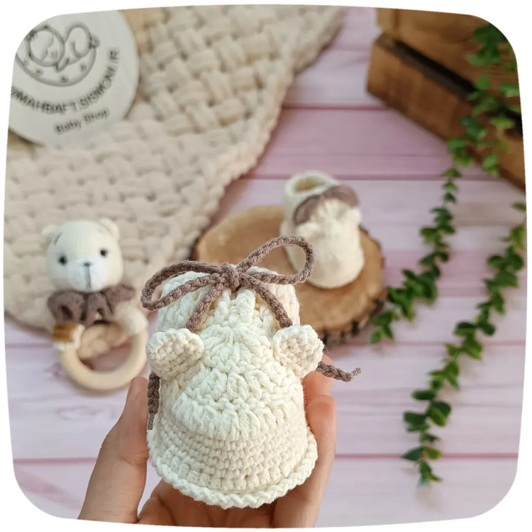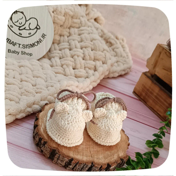 پاپوش نوزادی بافتنی مدل تدی مناسب صفر تا سه ماه کفی دولایه بافته شده با کاموای ترک