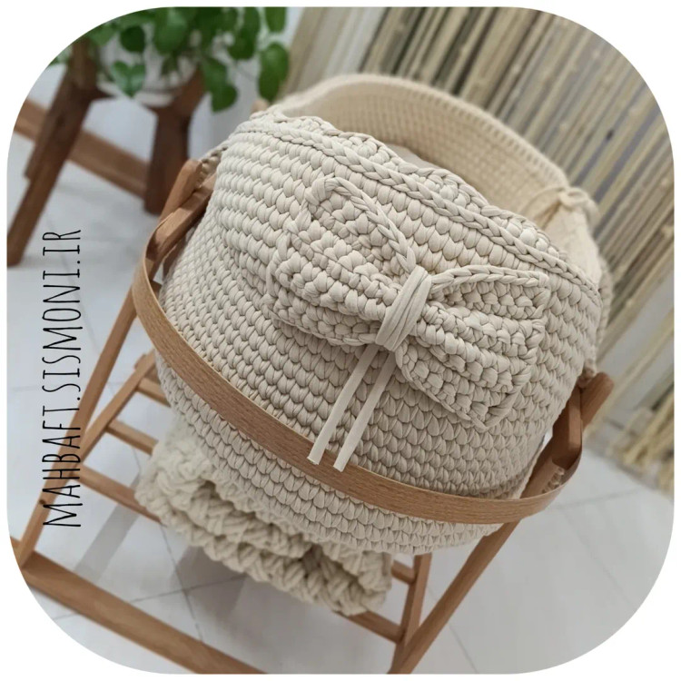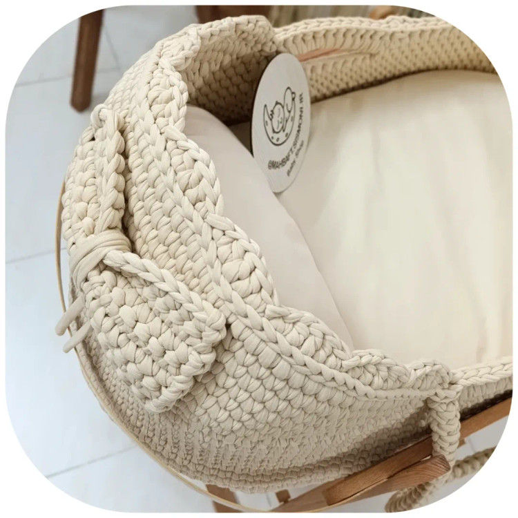 گهواره ای ساده که هم به عنوان گهواره نوزاد و هم تخت کنار مادر استفاده میشود. دارای پایه چوبی راش گرجستان، مشخصات کریر نیمه، سایبان و بالشت کتان نخ ترک.