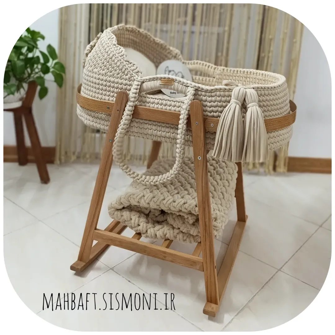 گهواره ای ساده که هم به عنوان گهواره نوزاد و هم تخت کنار مادر استفاده میشود. دارای پایه چوبی راش گرجستان، مشخصات کریر نیمه، سایبان و بالشت کتان نخ ترک.